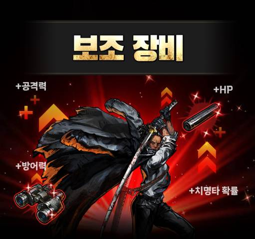 보조 장비로 야간 투시경과 소음기 총 2종이이 첫 선을 보였으며 캐릭터에게 장착해 능력치를 향상시킬 수 있다. 보조 장비는 전용 강화 아이템인 일반 수리 도구와 고급 수리 도구를 사용해 1성부터 최대 6성까지 강화할 수 있다. 강화 레벨에 따라 더 높은 수치의 옵션이 적용되며 착용한 보조 장비의 능력치는 게임 내 모든 콘텐츠에 적용된다.
