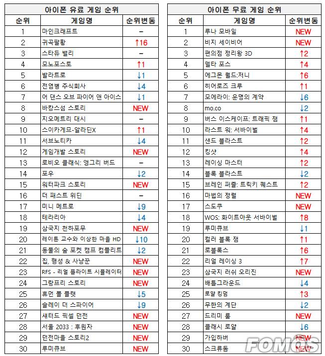 이번 주 아이폰 무료 게임 순위에서는 '루나 모바일'이 1위를 차지한 가운데 지난주 중위권에 머물던 게임의 순위 상승이 엿보였다.