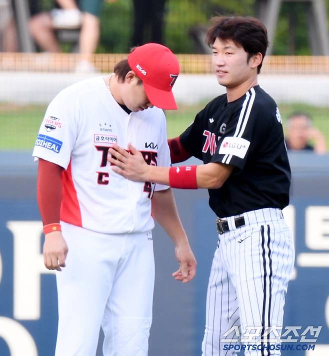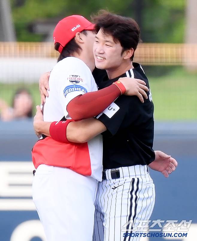 경기 전 화기애애했던 만남을 뒤로한 채 시작된 경기는 역전과 역전을 거듭하며 숨가쁘게 흘러갔다. LG 송승기와 KIA 제임스 네일이 선발 맞대결. LG가 4회 김현수의 1타점 적시타와 6회 문보경의 스리런포로 4-0으로 앞서갔다.