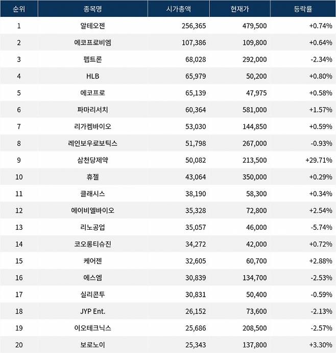 한국거래소에 따르면, 시가총액 1위 알테오젠(196170)(액면가 500원)은 현재가 479,500원으로 전 거래일 대비 0.74% 상승하며 보합세를 유지하고 있다.