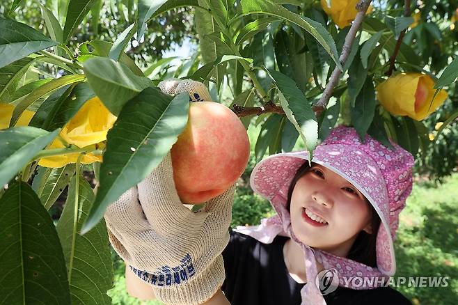 (임실=연합뉴스) 전북 임실군조합공동사업법인 복숭아 공선회가 공동출하하는 임실N복숭아의 본격적인 출하 시기를 맞아 23일 임실군 오수면의 한 복숭아 농가에서 관련 공무원이 복숭아를 홍보하고 있다. 해발 250∼400m의 청정 고랭지에서 재배하는 임실N복숭아는 육질이 단단하고 당도가 높은 것이 특징이다. 2025.7.23 [임실군 제공. 재판매 및 DB 금지]