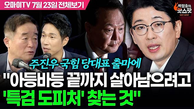 ◎ 박정호 > 사실 이제 한덕수 전 총리가 대선 출마했던 그때 상황도 좀 오버랩이 되는 것 같기도 하고. 수사를 앞둔 상황에서 뭐 일단 일정은 정해지지 않았지만 특검에서 수사 가능성, 조사 가능성, 소환 가능성 얘기하는 상황에서 주진우 의원이 대표 출마 선언을 했다. 이 부분 봐야 되네요.