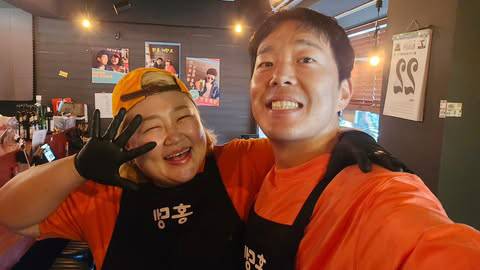 공개된 사진 속 홍윤화와 김민기는 앞치마를 맞춰 입은 채 다정하게 셀카를 찍으며 첫 장사 성공에 들뜬 모습이다. 홍윤화는 주먹을 쥔 채 활짝 웃고 김민기는 익숙한 표정으로 카메라를 응시하며 오픈 기념의 설렘을 전했다. 또 다른 사진에서는 다섯 손가락을 펴 보이며 "매진"을 의미하는 듯한 익살스러운 포즈도 눈길을 끌었다.