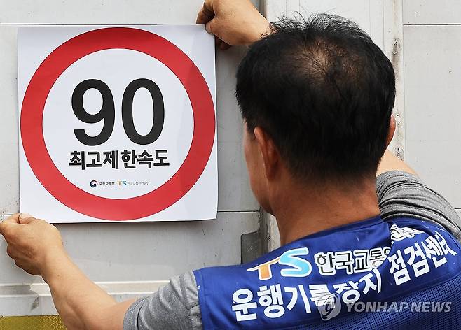 (화성=연합뉴스) 홍기원 기자 = 23일 경기도 화성시 한국교통안전공단(TS) 운행기록장치(DTG) 점검센터에서 관계자가 화물차에 '최고 제한속도 스티커'를 부착하고 있다.