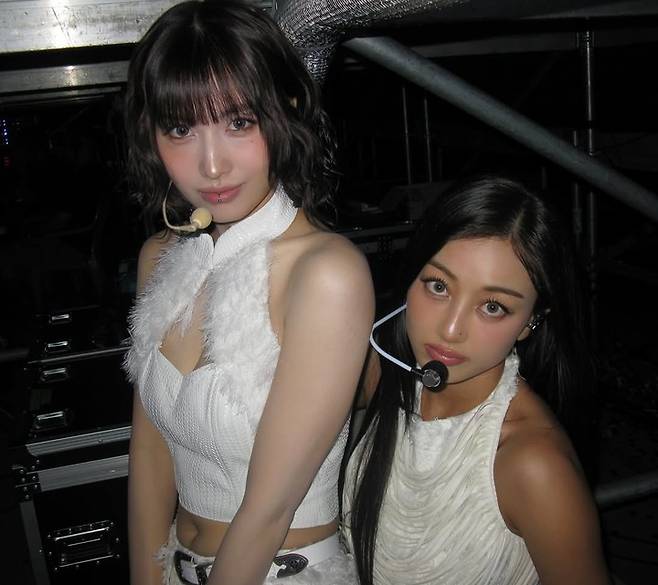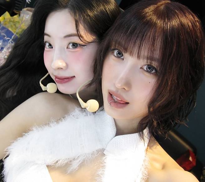 지효와 함께 화이트 의상을 입고 무대 시작전 모습을 공유했다. 모모와 지효는 무대 뒤에서 마이크를 착용한 채 카메라를 빤히 쳐다보며 이쁜 미모를 자랑하고 있다.