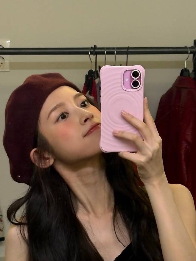 사진 속 아린은 버건디 컬러의 베레모를 쓰고 귀엽고 사랑스러운 표정을 지으며 상큼함을 뽐낸다. 자연스러운 웨이브 헤어가 그녀의 순수한 매력을 더욱 강조하고, 블러셔와 핑크 톤의 립은 화사한 이미지를 연출한다.