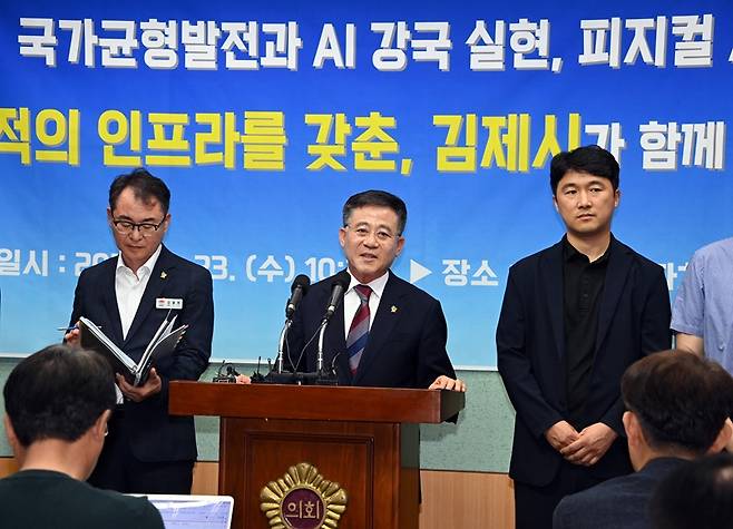 정성주 김제시장은 23일 전북특별자치도의회 브리핑룸에서 기자회견을 열고 피지컬 AI 기반 인공지능 대전환(AX)을 주도하기 위한 김제시의 전략적 구상과 참여 의지를 밝혔다.