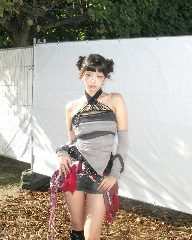사진 속 레이는 그레이 톤의 상의와 미니 쇼츠로 매치해 강한 개성을 표현하고 있다.