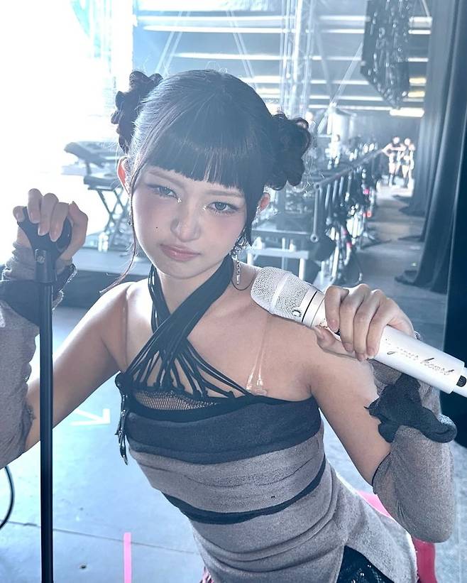 그녀는 마이크를 들고 포즈를 취하며 무대 뒤에서 찍은 사진을 공개했다. 특히, 블랙과 그레이 톤의 의상과 함께 스타일리시한 헤어스타일이 눈길을 끌었다.