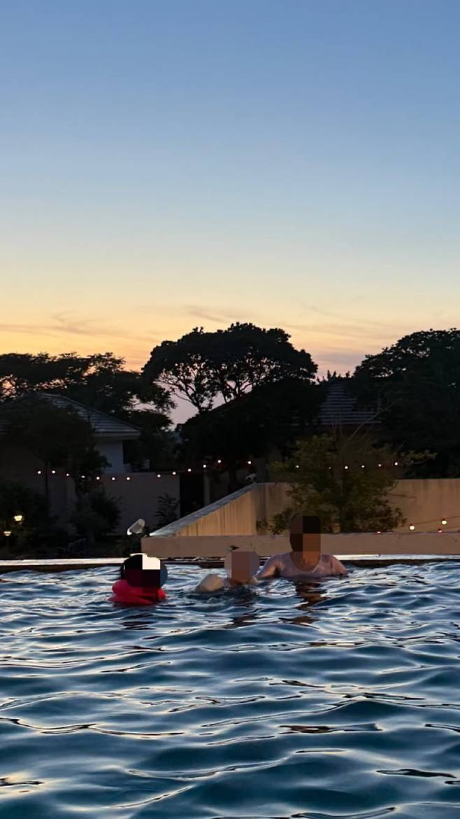 공개된 사진 속 최희는 남편과 꼭 붙어 다정한 사진을 남겼다. 두 아이는 수영장에서 물놀이를 즐기는 모습이다.