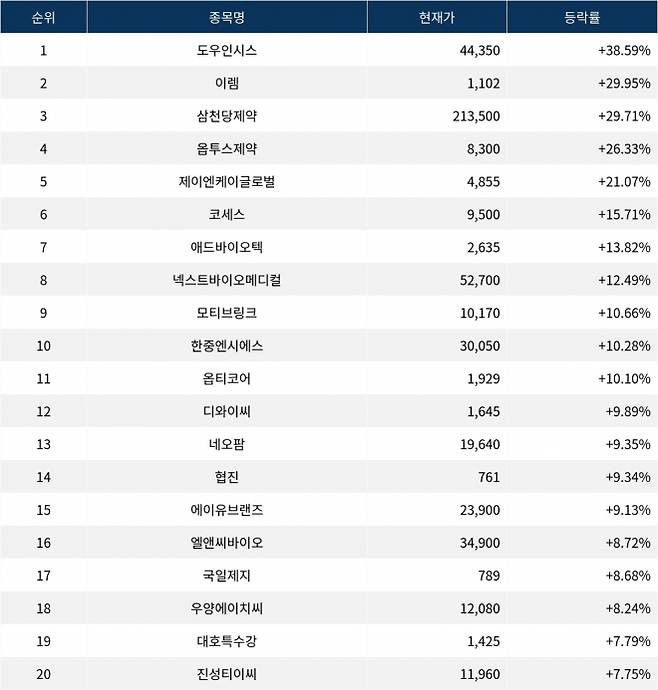 이어 상승률 2위 이렘(009730)은 주가가 29.95% 상한가를 기록하며 종가 1,102원에 상승 마감했다. 상승률 3위 삼천당제약(000250)의 주가는 213,500원으로 29.71% 폭등하며 부진했다. 상승률 4위 옵투스제약(131030)은 26.33% 폭등하며 8,300원에 마감했다. 상승률 5위 제이엔케이글로벌(126880)은 21.07%의 상승세를 타고 종가 4,855원에 마감했다.