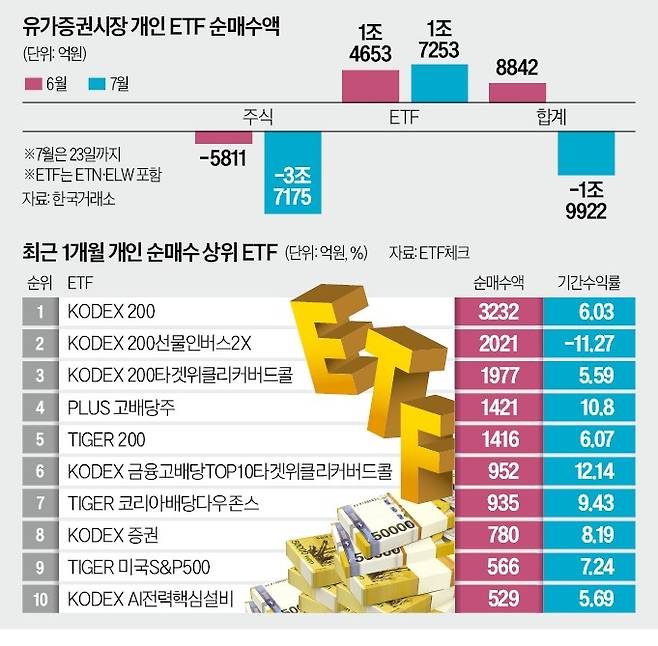 지난달로 시기를 넓혀보면 ‘주식 매도·ETF 매수’ 흐름은 더 두드러진다. 지난달 5811억원어치 주식을 팔아치운 개인은 ETF를 1조4653억원어치 사들였다. 이를 합친 개인 순매수액은 총 8842억원이다. 임태혁 삼성자산운용 ETF운용본부장은 “퇴직연금 계좌의 경우 개인이 ETF를 매수해도 기관 매수로 집계하기 때문에 순수 개인 ETF 투자금이 그만큼 많이 들어왔다는 의미”라고 말했다.