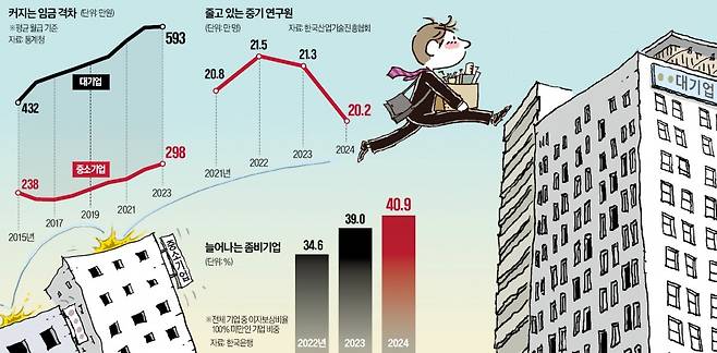 중소기업을 떠나는 가장 큰 이유는 임금이다. 통계청에 따르면 2015년 중소기업 근로자의 평균 월급은 238만원으로 대기업 근로자(432만원)보다 194만원 적었다. 이후 매년 격차가 커지면서 2023년 중소기업 근로자의 평균 월급은 298만원으로 대기업 평균(593만원)의 절반 수준에 그쳤다.