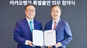카카오뱅크(대표 윤호영·오른쪽)가 지난 22일 경기신용보증재단과 85억원을 특별 출연하는 내용의 업무협약을 체결했다. 경기신보는 출연금을 재원으로 다음달 경기 지역 개인사업자에게 최대 1억원을 빌려주는 상생 보증 대출상품을 출시하기로 했다.