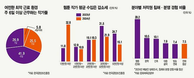 플랫폼 영향력이 커지며 나오는 가장 큰 문제는 ‘수익 배분’이다. 당장 등단이 절실한 작가는 비교적 적은 수입에도 불구하고 플랫폼과 계약을 체결할 수밖에 없는 실정에 놓였다. 실제 웹툰 작가 수입은 줄어드는 양상이다. 한국콘텐츠진흥원 조사에 따르면, 지난해 웹툰 작가 연간 총 수입 평균값은 약 4270만원으로 전년(약 6480만원) 대비 크게 줄었다. 같은 기간 중위값 역시 3500만원에서 3400만원으로 감소했다. 한 웹툰 스튜디오 관계자는 “플랫폼 수 축소는 공급 기회 제한과 함께 지속 가능한 제작비 확보에 어려움을 겪게 하는 요인”이라며 “특히 계약 체결 전 수정 사항을 요구해도 거절당하는 일이 빈번하다”고 설명했다.