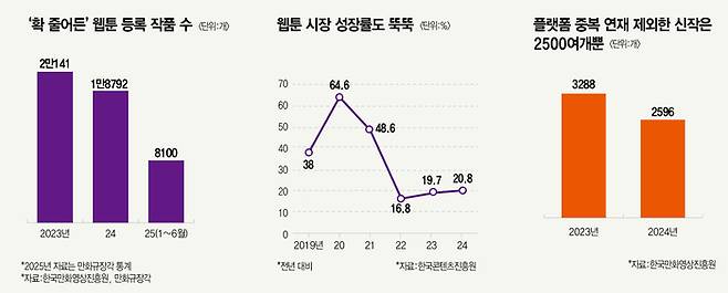 전문가들은 국내 웹툰 성장세가 임계점을 마주했다고 말한다. 김정영 연성대 웹툰만화콘텐츠과 교수는 “국내 시장을 보면 2010년대 초반부터 시작해 2023년까지 가파르게 성장했다. 단 한 번도 정체기를 겪은 적 없다. 이제야 구조조정기에 도달했다고 판단한다”며 “임계점에 도달한 상황”이라고 말했다. 통계로도 나타난다. 한국만화영상진흥원 만화규장각 데이터베이스에 따르면, 올해 상반기 등록된 웹툰 콘텐츠 수는 8100개다. 전년 동기(9889개) 대비 18% 감소했다.