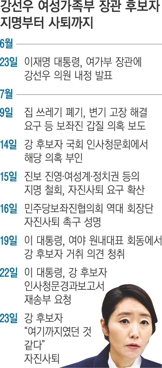 강 후보자 거취 문제는 23일로 취임 50일을 맞은 이 대통령이 내치에서 맞닥뜨린 첫 시험대로 불렸다. 갑질 의혹이 불거진 지 2주 만에 강 후보자가 자진사퇴하며 상황은 일단락됐다. 다만 그 기간 국면마다 이 대통령의 대응에 각계 반발이 확산해 첫 시험대를 매끄럽게 넘지 못했다는 평가가 불가피해졌다.
