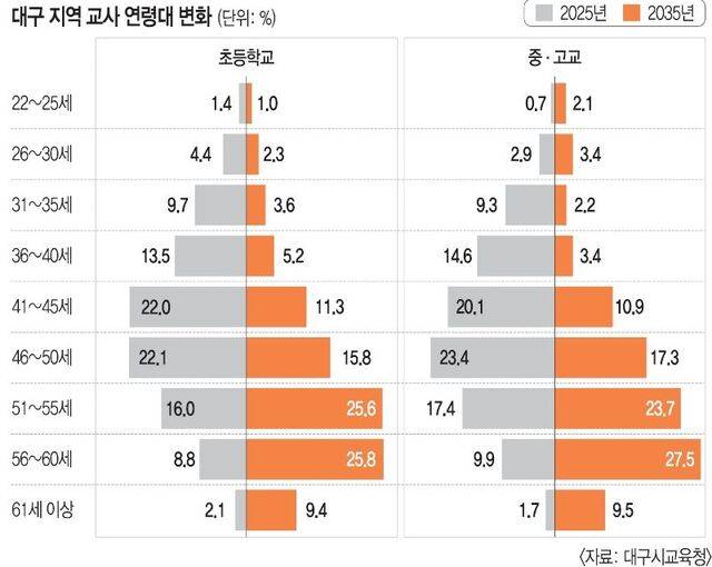 현재 대구지역 교사의 교사 연령대별 구성비는 위·아래가 좁고 가운데가 두툼한 형태다. 최근 신규 임용이 줄어 20대가 적고 30대와 40대가 다수를 차지한다. 각 연령대별로 균형이 맞는 상황이다. 하지만 불과 10년 뒤 고령화의 전형적인 형태인 역피라미드로 바뀐다.
