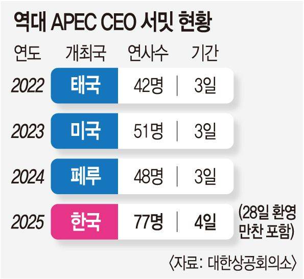 대한상의는 이번 APEC CEO 서밋의 차별화 전략으로 과거 서밋보다 기간이 하루 늘었다는 점, 스타급 CEO 초청을 확대한다는 점, 정상과의 1대 1 미팅을 진행한다는 점을 꼽고 있다. 2022년 태국, 2023년 미국, 2024년 페루에서 열린 APEC CEO 서밋은 3일간 진행됐지만 경주 서밋은 첫날 환영만찬까지 더해 4일로 늘었다. 서밋에 참석하는 연사도 77명으로 가장 많을 것으로 예상된다.