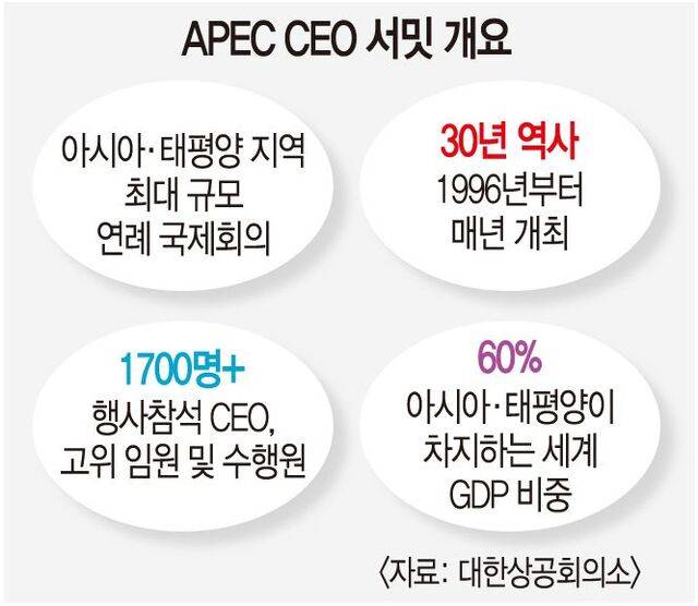APEC CEO 서밋은 회원국 정상들과 CEO들이 만나 글로벌 어젠다를 논의하는 경제인 행사다. 아시아태평양 지역 최대 규모의 연례 국제회의로 1996년부터 매년 개최되고 있다. 오는 10월 28일부터 31일까지 경주에서 열리는 APEC CEO 서밋에는 글로벌 기업의 CEO와 고위 임원 등이 1700명 이상 참석할 것으로 예상된다. 대한상의는 APEC 개최로 인한 경제 효과가 7조4000억원, 취업 유발 효과가 2만2634명에 이를 것으로 전망하고 있다.