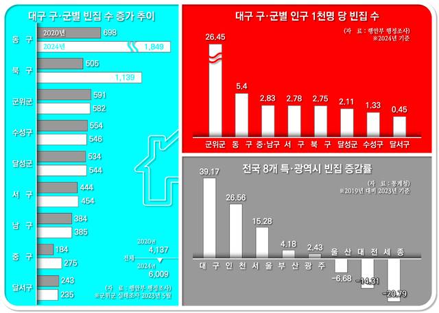2020년 실태조사 당시 4천여 채에 머물렀던 빈집 수는 2024년 행정조사 당시 6천여 채로 늘었다. 대구 9개 구·군중에서 동구가 698채에서 1천849채로, 북구가 505채에서 1천139채로 폭발적으로 불어났다. 최초 조사 시 재개발과 재건축, 예정구역 등의 빈집은 제외하고 조사했었으나 행정조사는 기초자료 전체를 전수조사해 증가한 것으로 보인다.