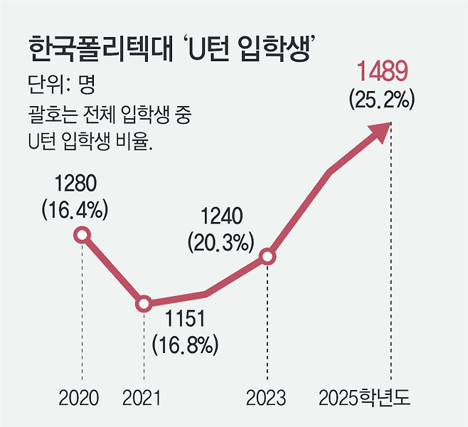 한국폴리텍대에 입학한 유턴 입학생은 2020학년도 1280명에서 올해 1489명으로 매년 증가세를 보였다. 전체 입학생 중 유턴 입학생 비율도 같은 기간 16.4%에서 25.2%로 8.8%포인트 증가했다.