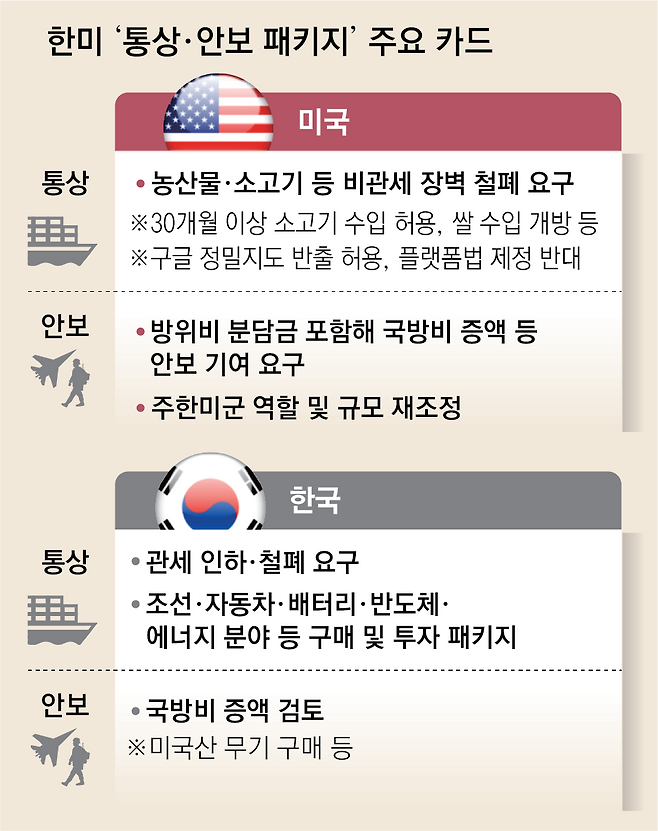 이에 따라 관건은 관세 협상과 병행해 이뤄지는 국방비 지출 증액 등 안보 협상을 통해 미국을 설득할 수 있느냐가 될 것이라는 지적이 나온다. 20일 방미한 위성락 국가안보실장은 마코 루비오 국무장관 겸 백악관 국가안보보좌관 등 트럼프 행정부 주요 당국자들을 만나 안보 카드를 제시하며 패키지 합의를 논의하고 한미 정상회담 개최를 제안한 것으로 알려졌다.