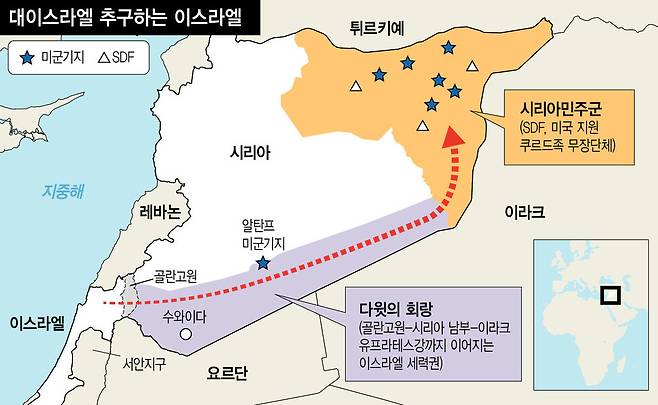 지난 14일부터 시리아 남부 수와이다에서 베두인족과 드루즈족 간 유혈 분쟁이 발생하자, 이스라엘은 시리아 남부에 군사력을 대대적으로 투입했다. 시리아 정부군 탱크를 공격하는 한편 이틀 만에 수도 다마스쿠스의 대통령궁 인근 국방부까지 폭격했다. 이를 계기로 이스라엘이 시리아 남부를 점령하거나 세력권을 구축할 수 있다면, 일거에 이라크의 유프라테스강까지 세력권 확장이 가능하다는 계산이 섰다고 풀이된다. 그 중간에는 요르단과 접경한 시리아 동부의 알탄프 미군 기지가 있고, 이어서 시리아 북부는 미국의 지원을 받는 쿠르드족의 시리아민주군(SDF) 영역이기 때문이다.