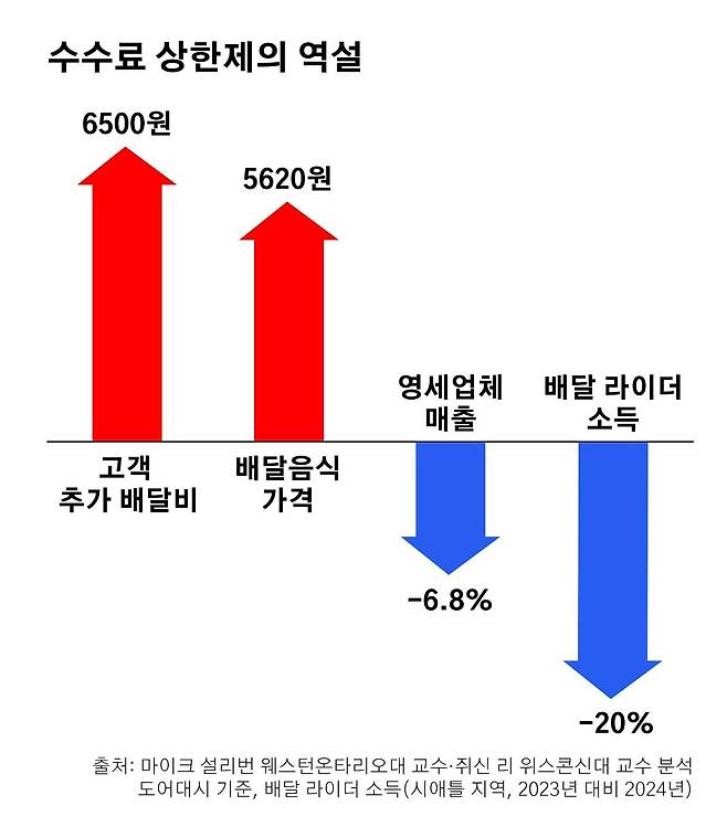 #미국 시애틀은 2022년 배달앱 수수료를 30%에서 15% 낮추고, 배달 라이더 시급을 최저임금보다 높은 30달러로 인상한 정책을 시행했다. 이후 미국 최대 배달앱 '도어대시'는 시애틀 지역에서 적자 폭이 확대됐고, 이를 메우기 위해 소비자들에게 주문당 4.99달러(6900원), 거리당 1.99달러(2700원) 등 최대 9600원의 배달비를 청구했다.