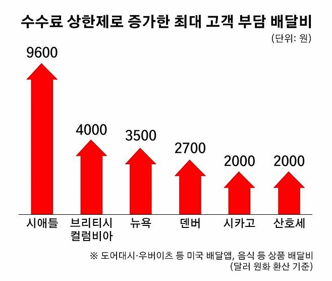 도어대시와 우버이츠 등 미국 배달앱들은 수수료 상한제 시행 이후 약 2200억원의 손실을 본 것으로 추정된다. 업체들은 이 비용을 소비자에게 부과해 적자를 보전했다. 일례로 수수료를 주문당 20%로 제한한 캐나다 브리티시컬럼비아주에선 우버이츠는 2달러, 도어대시는 0.99~2.99달러의 배달비를 소비자에게 청구한다.