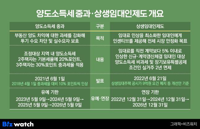 다만 일몰 기한을 두고 있는 부동산 관련 세금 혜택 손질 여부가 관건이다. 그동안 계속해서 시행을 미룬 조정지역 내 다주택자 대상 양도소득세 중과와 계약 대상자 범위를 넓힌 상생임대주택 양도세 비과세 등이 대표적이다.