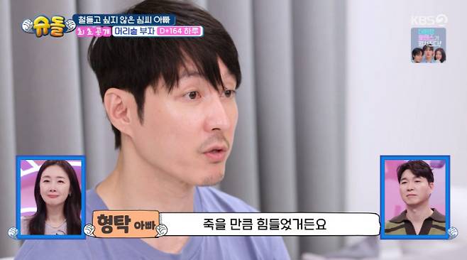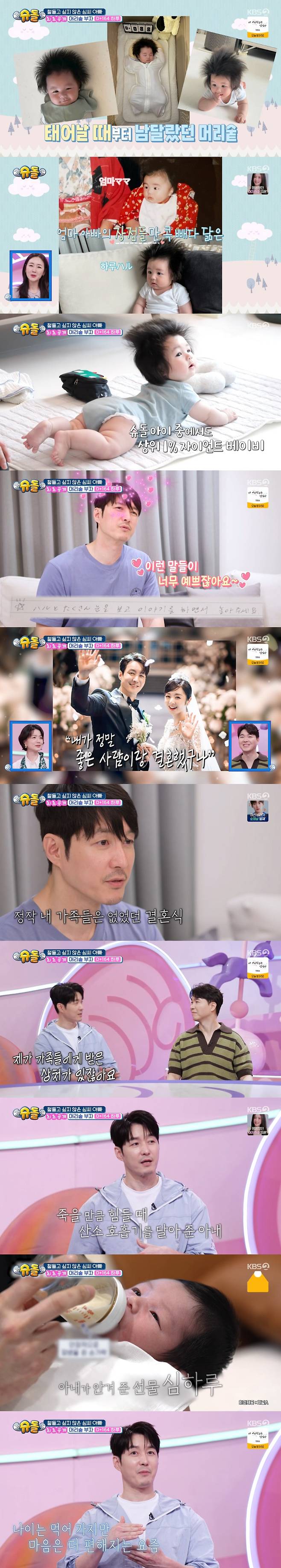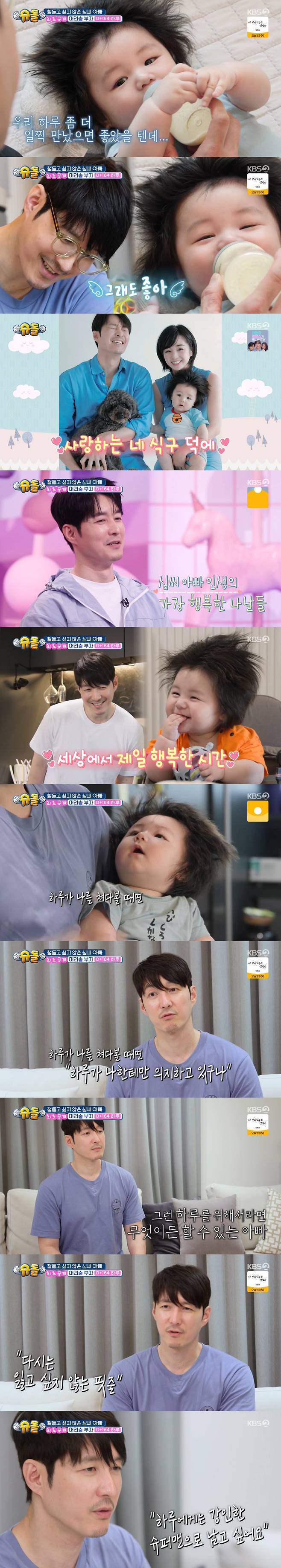 심형탁은 "하루가 나를 쳐다볼 때면 '나한테만 의지하고 있구나'라는 생각이 들더라. 그러면 '내가 하루를 위해서, 예쁜 내 아들을 위해서 포기하고 해야 할 것 들이 많겠구나'라는 생각이 들더라"고 했다.