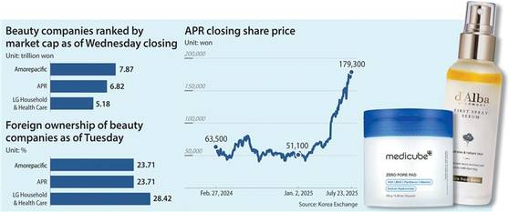 A decade ago, Amorepacific and LG Household & Health Care were the undisputed titans of Korea's cosmetics sector. They rode a wave of global popularity, powered largely by Chinese consumers to success, with Amorepacific becoming Korea's fifth-largest company by market capitalization in 2015. That ranking has since slid to No. 70 on the Kospi as of Wednesday. Meanwhile, APR, the fast-rising beauty company behind Medicube, surpassed LG Household & Health Care to become the second-largest beauty firm in Korea, after only Amorepacific, just after its stock market debut February last year.