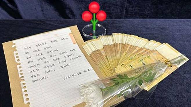 그 안에는 집중호우 희생자를 추모하는 국화꽃 한 송이와 정성스레 눌러쓴 손 편지, 현금 500만 원이 든 봉투가 있었습니다.