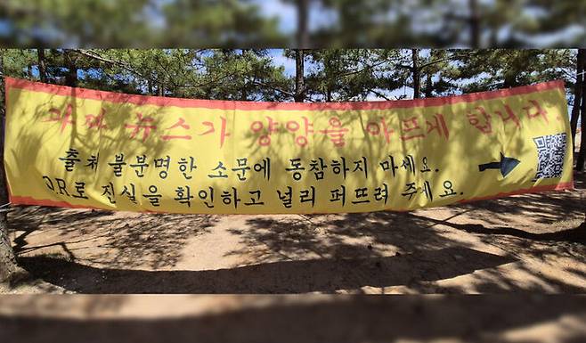 해당 현수막에 기재된 QR코드를 스캔하면 '[긴급 공유] 양양을 무너뜨리려는 조직적인 여론조작의 실체'라는 영상을 확인할 수 있습니다.