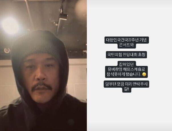 JK김동욱은 24일 자신의 SNS를 통해 "대한민국 건국 77주년 기념 콘서트와 국민의힘 전당대회에 초대를 받았지만, 이미 오래전부터 잡혀 있던 뮤직비디오 촬영 등의 해외 일정으로 인해 참석하지 못하게 됐다"며 아쉬움을 전했다.