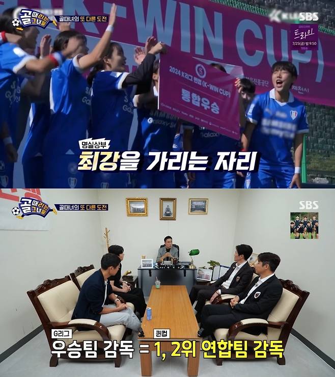 이를 위해 G리그 최종 1-2위팀(결승 진출 2팀) 소속 선수들로 <골때녀>를 대표하는 단일팀이 만들어져 총 27개 참가팀이 우승컵을 놓고 치열한 경합을 벌이기로 한 것이다. 하석주 위원장으로부터 이 소식을 전달받은 준결승 진출 4개팀 감독은 저마다 기대감을 드러내면서 결승 진출의 의지를 다시금 불태웠다.