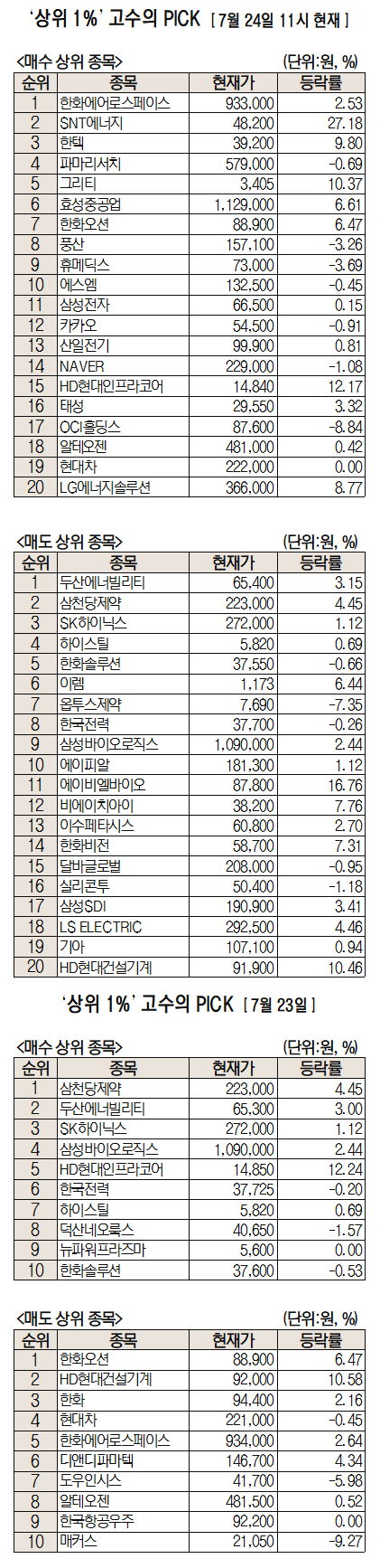 미래에셋증권은 자사 고객 중에서 지난 1개월간 수익률 상위 1% 투자자들의 매매 종목을 집계해 실시간·전일·최근 5일 기준으로 모바일트레이딩시스템(MTS)상에서 공개하고 있다. 이 통계 데이터는 미래에셋증권의 의견과 무관한 단순 정보 안내이며 각각의 투자자 개인에게 맞는 투자 또는 수익 달성을 보장하지 않는다. 또 테마주 관련종목은 이상 급등락 가능성이 있으므로 유의해야 한다.