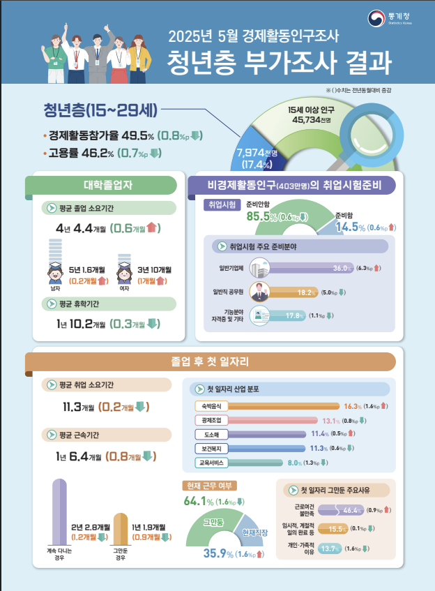 첫 일자리가 임금근로자인 청년층이 첫 취업까지 걸린 기간은 11.3개월로 작년보다 0.2개월 줄었습니다. 기간별로 보면 3개월 미만이 45.8%로 전년 동월 대비 1.9%p 줄고, 3년 이상은 9.9%로 0.2%p 늘었습니다.