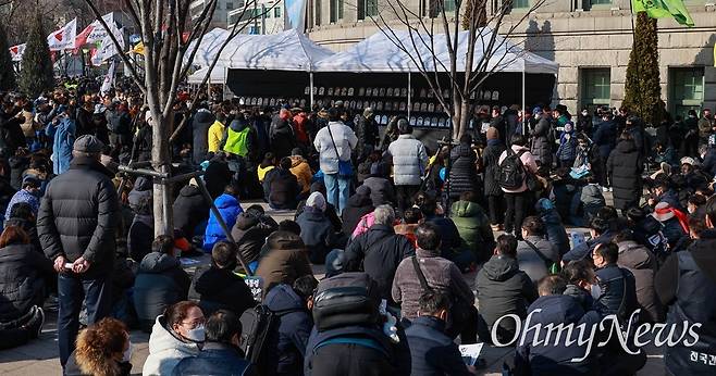 | ▲ 23.2.4. 유가족들과 시민들이 서울시청 앞에 분향소를 설치한 뒤 서울시와 경찰의 제지를 막기 위해 합동분향소를 에워싸며 보호했다. |