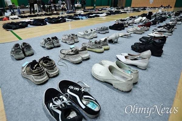 | ▲ 22.11.1. 용산구 다목적 실내체육관에는 참사 희생자들의 유실물센터가 마련되었다. 희생자의 옷, 신발 등이 놓여있다. 경찰은 유류품을 수거해 마약 검사를 의뢰했다. 조사 결과 모두 음성이었다. |