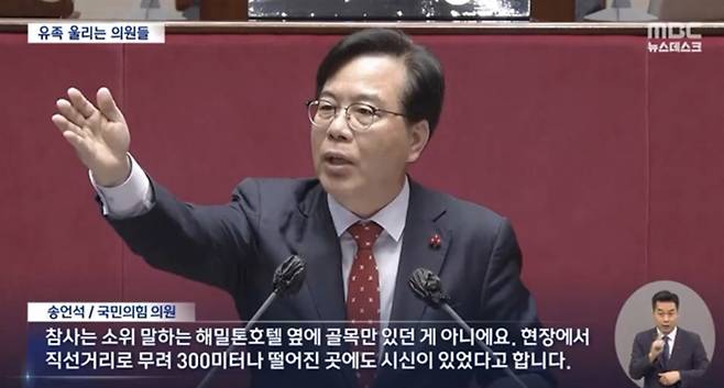 | ▲ 22.12.11. 송언석 국민의힘 의원(현 국민의힘 비상대책위원장 겸 원내대표)은 국회 본회의 의사진행발언을 통해 이태원 참사가 발생했을 때 압사 사고 외 또 다른 사고가 있었다고 근거 없는 의혹을 주장했다. |