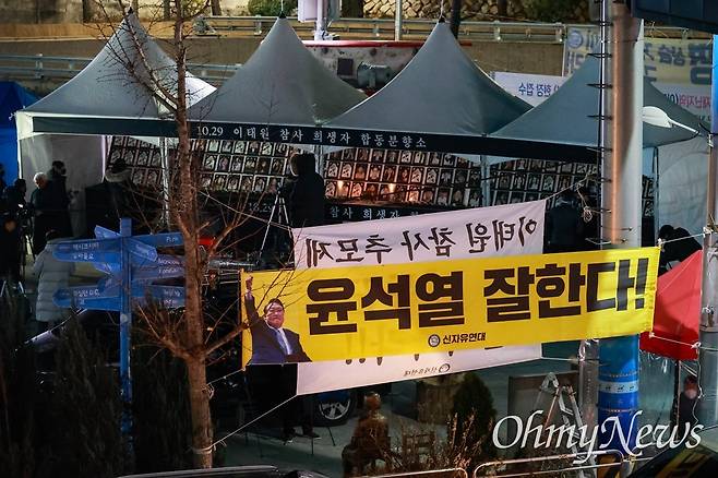 | ▲ 22.12.14. 녹사평역 사거리 분향소 앞에 ‘이태원 참사 추모제 정치 선동꾼들 물러나라’, ‘윤석열 잘한다’가 적힌 현수막이 걸렸다. |