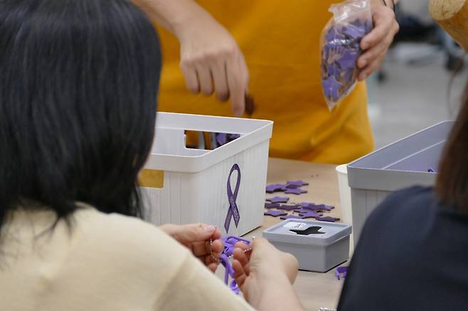 | ▲ 지난 19일 10·29 이태원 참사 유가족협의회와 시민들이 모여 추모제에서 시민들에게 나눠 줄 목걸이를 만들었다. |
