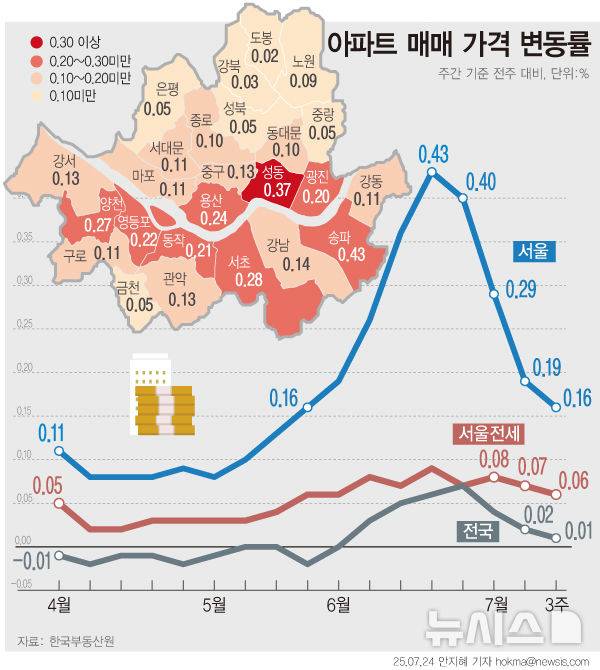 [서울=뉴시스]이연희 기자 = 6·27 고강도 대출규제로 인해 서울 집값의 상승폭이 4주 연속 줄어들면서 관망세가 짙어졌다. 재건축·선호단지 중심으로 서울 집값의 오름세는 25주 연속 이어지고 있지만 상승 속도는 대선 전인 5월 말 수준으로 둔화했다.
