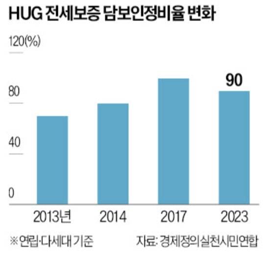 경실련은 반환보증의 담보인정비율(LTV )을 60% 수준으로 내려야 한다는 의견도 냈다. 2017년 반환보증 LTV가 100%로 확대된 것이 ‘전세 사기’와 전셋값 상승 등을 부추겼다는 판단에서다. 경실련은 “집값이 1억원인데 전세보증금도 1억원인 ‘역전세’ 발생 위험이 높은 주택까지 정부가 책임져 주겠다고 한 것”이라고 말했다. LTV가 60%까지 낮아지면 보증료 부담도 덜 것이란 관측이 나온다.
