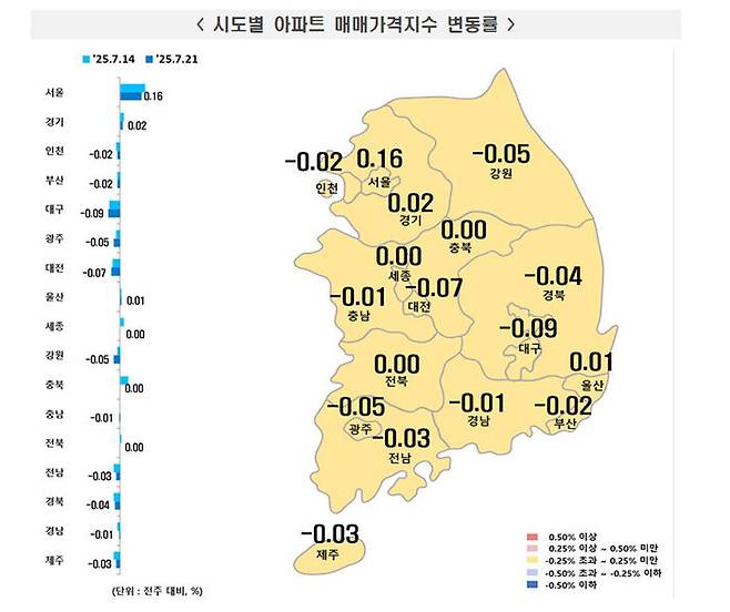 한국부동산원이 오늘(24일) 발표한 7월 셋째 주(7월 21일 기준) 전국 주간 아파트 가격 동향 조사 결과를 보면 서울 아파트 매매가격은 0.16% 올라 전주(0.19%) 대비 상승폭이 0.03%포인트 축소됐습니다.