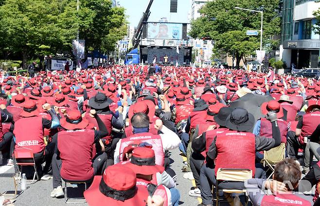 [울산=뉴시스] 배병수 기자 = 24일 울산시청 남문앞에서 열린 2025 전국플랜트건설 노동조합 임단투승리 결의대회에서 조합원들이 구호를 외치고 있다. 2025.07.24.bbs@newsis.com.