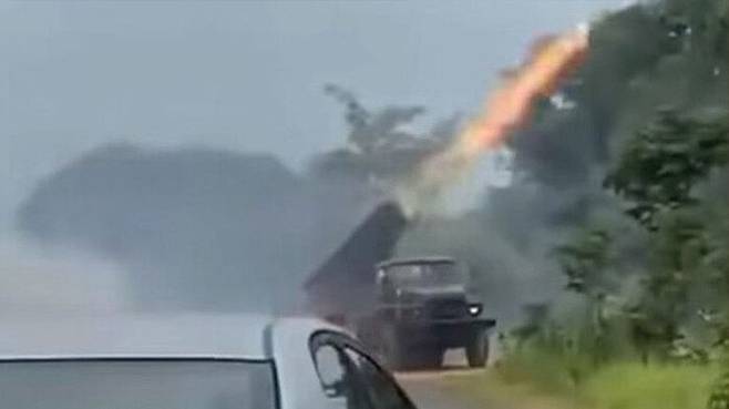 ▲ 24일(현지시간) 캄보디아군이 러시아산 BM-21 다연장로켓포를 태국 쪽을 향해 발사하는 장면