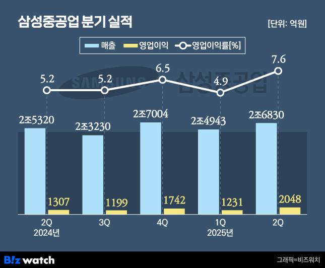 지난 2분기 삼성중공업의 영업이익률은 7.6%로, 작년 2분기(5.16%)보다 개선됐다.